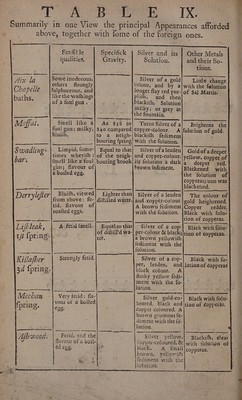Credit: An essay towards a natural, experimental and medicinal history of the mineral waters of Ireland. Wherein the several impregnating minerals, being investigated by a series of experiments, each water is reduced to its proper class ... / The whole illustrated with tables, exhibiting a clear view of the experiments in concert, and a comparison of the Irish to the English, and other foreign waters. Source: Wellcome Collection.