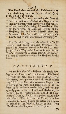 The true account of all the transactions before the Right Honourable the Lords, and others the commissioners for the affairs of the Chelsea Hospital : as far as relates to the admission and dismission of Samuel Lee, surgeon : to which is prefixed, a short account of the nature of a rupture / by John Ranby and Caesar Hawkins, Serjeant-Surgeons to His Majesty.