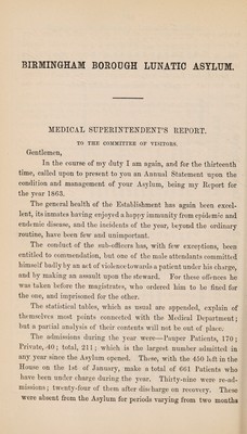 Report of the Committee of Visitors of the Lunatic Asylum for the Borough of Birmingham as presented to the Town Council, being their thirteenth annual report : together with the reports of the Medical Superintendent and Chaplain also an account of the receipts & payments to the end of the year 1863 / Birmingham Borough Lunatic Asylum.