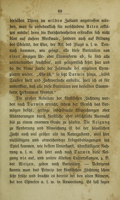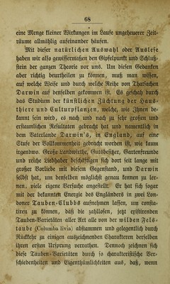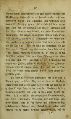 ![©enerationen aufeinanberfolgen unb tl^re Sßirfurtgen t)on ©efc^le(^t gu ©efd^led^t berart fummtren ober aufeinan^ berl^äufen muffen, um atoäl^lig pm ©ntftel^eu einer neuen 2lrt 5lnla^ ^u geben, oerftel^t fi(^ babei meiter non felbft, bag ber 3]organg fefir langer S^il^^ume unb fel^r nieler (Generationen bebarf, um jene^ 9^efultat l^er== beipfüljren. d§> mögen in einzelnen gälten nad; !I)ar^ min ]^unberte, taufenbe, ja gelmtaufenbe non (Generation nen barüber l^ingeftorben fein., — ^k§> tarn jjeboc^ nic^t al^ ein Sltangel, fonbern mu§ im (Gegentl^eil al^ ein ^org-ug ber ^^eorie angefefien merben, ba ja befanntli(^ 3eit gerabe ba^jenige 3Jtoment ift, an bem e^ in ber (Gefc^id^te unferer ©rbe unb i^rer Gilbungen am altern menigften fel^lt. SBir fd^minbeln bei ber ^etrad^tung ber Ungeheuern mel($e bie (Geologie für ba^ fommen jener Gilbungen au^geredhnk '^at^ unb im ^ern gleich ^^^il benen unfer eigene.^ ^afein faum einem 2lun genblide gleid^t. ©iefehen alfo, nerehrteSlnmefenbe, ba§ 2)armin’^ benfelben 2öeg betritt, ben bie ©eologie burd) ßpell unb beffen Gtadhfolger bereite nor ihm mit fo großem (Erfolge betreten h^^l ber überhaupt in ben S^taturmiffenfdhaften non 5i:ag gu 3::ag mehr ^oben ge^ rainnt, b. h- et erllärt bie großartigen Gtaturmirfungen, non beren erftaunli(^en 9lefultaten mir ung heute umn geben finben, au^ an fi($ fleinen unb anf(^einenb fehr unbebeutenben tlrfadhen ober S^aturfräften, mel(^e aber baburdh ein fo großem 9ftefultat hernorbringen, baß fie](https://iiif.wellcomecollection.org/image/b24887109_0079.jp2/full/800%2C/0/default.jpg)