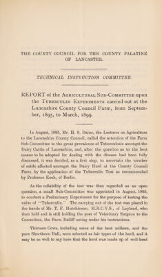 Report of the Agricultural Sub-Committee upon the tuberculin experiments carried out at the Lancaster County Council Farm, from September 1895 to March 1899 / the County Council for the County Palatine of Lancaster, Technical Instruction Committee.