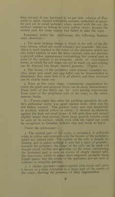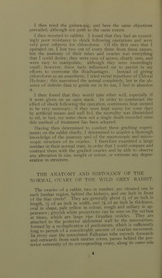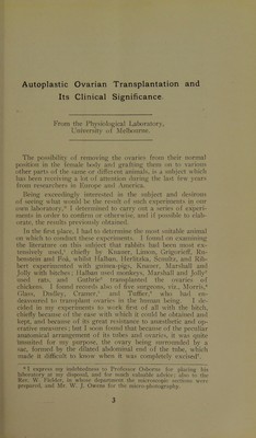 ![Autoplastic Ovarian Transplantation and Its Clinical Significance. From the Physiological Laboratory, Univ(M‘sity of Melbourne. The possibility of removing the ovaries from their normal position in the female body and grafting them on to various other ])arts of the same or different animals, is a subject which has been receiving a lot of attention during the last few years from researchers in Eurojre and .Vnierica. Being exceedingly interested in the subject and desirous of seeing what would be the result of such experiments in our own laboratory,* I determined to carry out a series of experi- ments in order to confirm or otherwise, and if possible to elab- orate, the results previously obtained. In the first place, I had to determine the most suitable animal on which to conduct these experiments. I found on examining the literature on this subject that rabbits had been most ex- tensively used,^ chiefly by Knauer, Limon, Grigorieff, Ru- benstein and Foa, whilst Flalban, Herlitzka, Scnultz, and Rib- bert experimented with guinea-pigs, Knauer, Marshall and Jolly with hitches: Halban used monkeys, Marshall and Jolly- used rats, and Guthrie''* transplanted the ovaries of chickens. I found records also of five surgeons, viz., Morris,'* Glass, Dudley, Cramer.and Tuffier, who had en- deavoured to trans])lant ovaries in the 'human being. I de- cided in my experiments to work first of all with the bitch, chiefly because of the ease with which it could be obtained and kept, and because of its great resistance to anaesthetic and op- erative measures ; but I soon found that because of the peculiar anatomical arrangement of its tubes and ovaries, it was quite unsuited for my purpose, the ovary being surrounded by a sac, formed by the dilated abdominal end of the tube, which made it difficult to know when it was completely excised^. * I express my indebtedness to Professor Osborne for placing his laboratory at my disposal, and for much valuable advice; also to the Rev. W. Fielder, in whose department the microscopic sections were prepared, and Mr. W. J. Owens for the micro-photography.](https://iiif.wellcomecollection.org/image/b22428884_0007.jp2/full/800%2C/0/default.jpg)