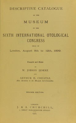 Descriptive catalogue of the museum of the sixth international otological congress : held in London, August 8th to 12th, 1899. / Compiled and edited by W. Jobson Horne and Arthur H. Cheatle.
