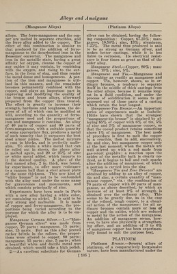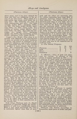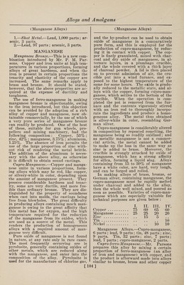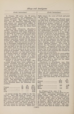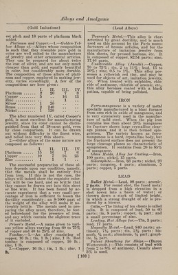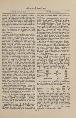 ![(Gold Imitations) time by a coating of colorless varnish, which excludes the air and prevents oxi¬ dation. Chrysochalk is used for most of the ordinary imitations of gold. Cheap watch chains and jewelry are manufac¬ tured from it, and it is widely used by the manufacturers of imitation-bronze or¬ naments. 2.—Another mixture called chrysochalk, also distinguished by a beautiful gold color, is composed of copper, 95 parts; tin, 5 parts. Copper and Antimony, Process for Pro¬ ducing Goldlike Alloy from.—This inven¬ tion, patented in Germany, covers a me¬ tallic alloy, to take the place of gold, which, even if exposed for some time to the action of ammoniacal and acid va¬ pors, does not oxidize or lose its gold color. It can be rolled and worked like gold, and has the appearance of genuine gold without containing the slightest ad¬ mixture of that metal, besides being much cheaper than other precious and semi¬ precious metals as well as the compounds and alloys used as substitutes for precious metals. The alloy consists of copper and antimony in the approximate ratio of' 100 to 6, and is produced by adding to molten copper, as soon as it has reached a cer¬ tain degree of heat, the said percentage of antimony. When the antimony has likewise melted and entered into intimate union with the copper, some charcoal ashes, magnesium and lime spar are added to the mass when the latter is still in the crucible. Although the action of this material admixture of flux is not entirely explained, the alloy loses thereby a cer¬ tain porosity otherwise present, and an exceedingly great density of the cast metal is obtained. Same can now be rolled, wrought, hammered, and soldered like gold, and wfiien polished has the appear¬ ance of genuine gold, while being consid¬ erably firmer than the latter. Factitious Gold.—1.—Copper, 16 parts; platinum, 7 parts ; zinc, 1 part; fused to¬ gether. This alloy resembles in color gold of 16 carats fine, or two-thirds, and will resist the action of nitric acid, unless very concentrated and boiling. 2.—The alloy has about the color of 9- carat gold: Silver, 2.48%; platinum, 32.02%; copper (by difference), 65.50%. Strong, boiling nitric acid has apparently no action on it, even when left in the acid for some time. Jewelry, Common.—1.—Refined copper, 3 parts; old Bristol bronze, 1 part; tin, 25 parts for every 100 parts of copper, the tin being replaced by a compound of [ (Gold Imitations) lead and antimony when a fine polish is needed. 2. —The following forms a fusible, mal¬ leable metal, easily worked by a silver¬ smith, resisting oxidation, and capable of being soldered : Copper, 720 parts ; nickel, 125 parts; bismuth, 10 parts; zinc, 90 parts ; soft iron, 20 parts ; tin, 20 parts. 3. —Sauvage has introduced the follow¬ ing alloy: Copper, 58 parts; zinc, 27 parts; nickel, 12 parts; tin, 2 parts; alumina, 0.5 part; bismuth, 0.5 part. The ingredients are fused separately, mixed, and the whole is run down into a homo¬ geneous mass, which is silvery, sonorous, malleable, ductile, tenacious, polishes well, and does not tarnish. 4. —As a silvery-looking alloy, Parker recommends : Copper, 70 parts ; manga¬ nese, 30 parts ; zinc, 20 to 35 parts. Or, if not needing to be subjected to high tem¬ perature : Copper, 49 parts ; manganese, 21 parts ; iron, 5 to 10 parts ; zinc, 5 to 10 parts. The solder used for it contains : Copper, 7 parts; manganese, 3 parts ; sil¬ ver, 1 to 2 parts. 5. —Cheap 4-carat gold. Copper, 9 parts ; gold, 2 parts ; silver, 1 part. Leaf Brass.—1.—This alloy is also called Dutch gold, or imitation gold leaf. It is made of copper, 77.75 to 84.5 parts; zinc, 15.5 to 22.25 parts. Its color is pale or bright yellow or greenish, accord¬ ing to the proportions of the metals. It has an unusual degree of ductility. 2.— Copper.. Zinc.. .. Copper.. Zinc.... Deep gold. Pure gold. Pale gold . 84.5 78 76 . 15.5 22 14 Deep gold. Deep gold. Gold. . 91 86 83 . 9 14 17 (Reddish) (Dark yellow) (Bright yellow) Mannheim Gold or Similor.—Mannheim in proportions about as I. follows II. III. IV. Copper .... .. . 83.7 89.8 88.9 75 Zinc.. .. . 9.3 9.9 10.3 25 Tin. 7.0 . 0.6 0.8 • • It has a fine yellow color, and was for¬ merly much used in making buttons and pressed articles resembling gold. Later alloys, however, surpass it in color, and it has fallen somewhat into disuse. One variety of Mannheim gold, so called, con¬ tains 1.40 parts of brass (composition, 3 Cu2 1 Zn) to 10 parts of copper and 0.1 part of zinc. Mock Gold.—1.—Copper, 16 parts ; platinum, 7 parts ; zinc, 1 part. 101]](https://iiif.wellcomecollection.org/image/b31361523_0115.jp2/full/800%2C/0/default.jpg)
