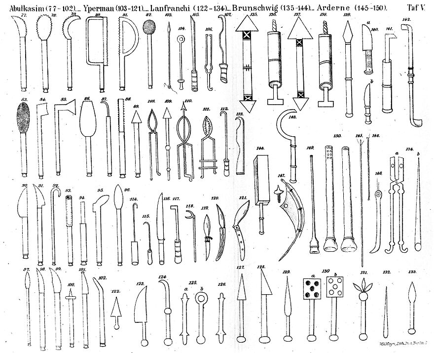 Credit: M0007609: Illustration of medieval surgical instruments from <i>Geschichte der Chirurgie und ihrer Ausübung...</i>. Source: Wellcome Collection.