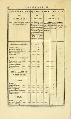 Credit: Formulaire pharmaceutique, à l'usage des hôpitaux militaires de la République Française / présenté par les inspecteurs généraux de Service de Santé des Armées de Terre, et approuvé par le Ministre Directeur de l'Administration de la Guerre. Source: Wellcome Collection.