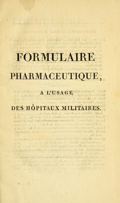 Formulaire pharmaceutique, à l'usage des hôpitaux militaires de la République Française / présenté par les inspecteurs généraux de Service de Santé des Armées de Terre, et approuvé par le Ministre Directeur de l'Administration de la Guerre.