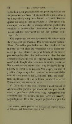 ![qu’on a commis des erreurs de diagnostic graves, et qu’un grand nombre d’opérations ont été laissées inachevées, par suite d’adhérences trop solides ou trop étendues, que des opérateurs le plus souvent timorés , inhabiles et inexpérimentés n’ont pas cru pouvoir surmonter, ou auxquelles ils ne s’attendaient point. M. R. Lee (l),en faisant le recensement de 162 cas d'ovariotomie, pratiqués dans la Grande-Bretagne jus- qu’en 1850, démontra que dans 60 cas, dont 19 ont été mortels, la tumeur n’a pas été enlevée. D’après M. Sawyer (2), sur 10 cas d’opérations d’ovariotomie tentées ou pratiquées en Californie jusqu’en 1860, 7 se rapportaient à des tumeurs de l’ovaire, 6 devinrent mortelles : l’opération , dans 3 de ces cas, fut interrompue et resta inachevée par suite de complications inattendues. Dans 3 cas, il y eut des erreurs de diagnostic. D’après M. Hamilton (3), sur 51 cas d’opérations d’ovariotomie entreprises en Ohio jusqu’en 1859, 21 opérées se rétablirent après l’extirpation de la tumeur. Dans 3 cas , l’opération fut tout de suite interrompue par suite d’adhérences trop compliquées; les trois opérées se rétablirent. Dans 5 cas, il y eut des erreurs de diagnostic. (1) R. Lee, An analysis of cases of ovariotomy wich hâve occu- red in Great Drilain, dans i]fed. chir. Transact., t. XXXIV, p. 10. Londres, 1851. (2) Americ. Journ. ofthemed. sc., 1860, p. 46. (3) Ohiomed, andsin'g. Journ.,noy. IS.'iO.](https://iiif.wellcomecollection.org/image/b22333101_0068.jp2/full/800%2C/0/default.jpg)