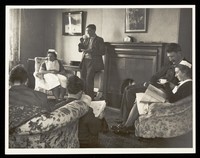 Nurses, male and female, sitting reading newspapers and drinking tea in nurses’ sitting room at second Nurses Home