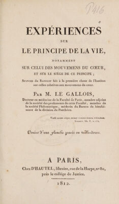 Credit: Expériences sur le principe de la vie, notamment sur celui des mouvemens du cœur, et sur le siège de ce principe; suivies du Rapport fait à la première classe de l'Institut sur celles relatives aux mouvemens du cœur / [M. Le Gallois (Julien Jean César)]. Source: Wellcome Collection.