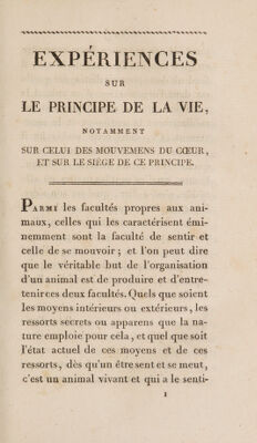 Expériences sur le principe de la vie, notamment sur celui des mouvemens du cœur, et sur le siège de ce principe; suivies du Rapport fait à la première classe de l'Institut sur celles relatives aux mouvemens du cœur / [M. Le Gallois (Julien Jean César)].