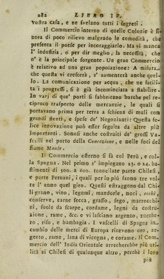 ![Voilra cafa, c ne {Velano tutti i fegreti li Commercio interno di quelle Colonie è fi- nora di poco rilievo malgrado le comodità, che' prefenta il paefe per incoraggiarlo. Ma vi manca F indù Aria , 6 per dir meglio, la neceflìtà, che1 n’ è la principale forgente.Un gran Commercio' è relativo ad una gran popolazione: A mifura^fl che quella vi crefcerà , s’ aumenterà anche quel—j lo. La comunicazione per acqua , che ne facili-i ta i progrcllì, lì è già incominciata a ftabilire.j In varj di que* porti lì fabbricano barche pel re-j ciproco trafporto delle mercanzie, le quali li portavano prima per terra a fchiena di muli eoa grandi lienti, e fpefe de’ Negozianti : Quella fe- lice innovazione può elTer feguira da altre più importanti . Sonolì anche collruiti de’ groffi Va- lutili nel porto della Concezione, e nelle foci del fiume Manìe . 1! Commercio ellerno fi fà col Perù , e col- la Spagna . Nel primo s’ impiegano 13. o 14. ba- fiìmenti di 500. a 600. tonnellate parte Chilefi , e parte Peruani, i quali perlopiù fanno tre vol-S te 1’ anno quel giro. Quelli ellraggono dal Chw li grano, vino, legumi, mandorle, noci, cocbi A conferve, carne fecca, graffo, fego , marrocchi-J ni, fuole da fcarpe, cordame, legni da collru- I zione , rame, &c. e vi Jafciano argento, zucche- 1 ro , rifo , e bambagia . I vafcelli di Spagna io^ j cambio delle merci di Europa ricevono oro , ar- ] gento , rame , lana di vicogna , e corame, il Com. j mercio dell’ India Orientale arrecherebbe più uti- lità ai Chilelì di qualunque altro, perchè i loro più](https://iiif.wellcomecollection.org/image/b28777281_0288.jp2/full/800%2C/0/default.jpg)