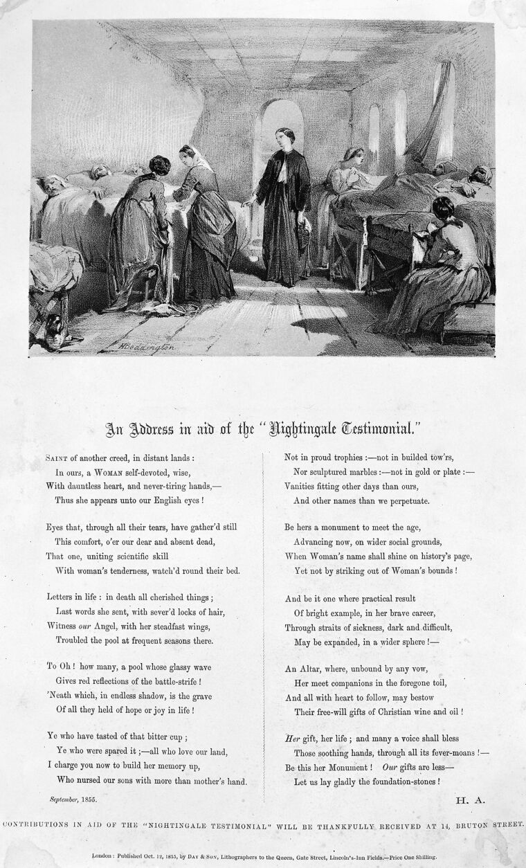 M0015999: Poem and scene showing Florence Nightingale in a hospital. Public Domain Mark. Source: Wellcome Collection.