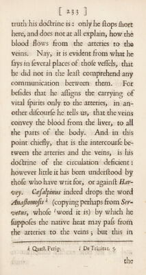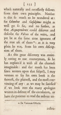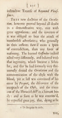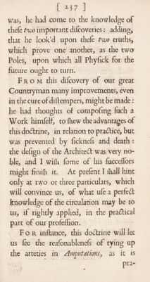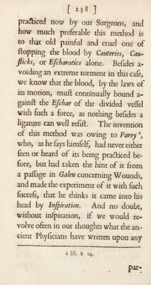 ![[ ] t practiced now by our Surgeons, and how much preferable this method is to that old painful and cruel one of flopping the blood by Cauteries, Cm- flicks, or Efcharotics alone. Befides a- voiding an extreme torment in this cafe, we know that the blood, by the laws of its motion, muft continually bound a- gainft the Efchar of the divided veffel with fuch a force, as nothing befides a ligature can well refift. The invention of this method was owing to Parey °, who, as he lays himlelfi had never either leen or heard of its being pra&iced be¬ fore, but had taken the hint of it from a paflage in Galen concerning Wounds, and made the experiment of it with fuch fuccels, that he thinks it came into his head by Infpiration. And no doubt, without inlpiration, if we would re¬ volve often in our thoughts what the an¬ cient Phyficians have written upon any i lib. x 24* - I](https://iiif.wellcomecollection.org/image/b30529360_0001_0246.jp2/full/800%2C/0/default.jpg)