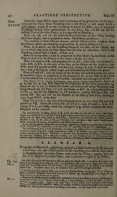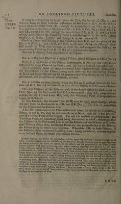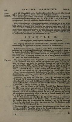 ![> c > * Plate XXXIX. fig* 155* A being determined (by its height above the Eye, the Seat of Ar (No. qft) and diftance from its Seat, with the inclination of the Line it is in, to the Picture (dac) or to its Seat) draw Ab through A, perpendicular to HI; make A a, Ac, and cb, in the ratio of Ab, bd, and dB ; as CE, to CE, No. i ; draw aK, cj’ and bL, parallel to HI, cuting the In'terfe&ion AL, at K, ], and L; from which, draw lines to the Vanifhing Point I, and through a, b, &c. to F, cuting them at/, d, h, &c. From/ and through b, d, &c. draw to H. bind the Center and Diftance of the Vanifhing Line HF, and the place of the Eye at O (Prob. i;) make CM, and ON, in the ratio Ad to At (No. 3.) draw OP parallel to NM; and, through d, draw Pr, and compleat the End ek, by means of the Vanifhing Point R (in IF) of a diagonal of a Square. ’ The reft is obvious, from inflection of the Figure. No. 4. is the fame Objea on a vertical Piftme, whofe Diftance is ED. (No. 1.) Here, C is the Center of the Pi&ure, anfwering to D (No. 2.) AB is the Inter¬ feron of the upper Plane of the Crofs; and, AD and BE of the upright paces. I he Intel feeling Point of every horizontal Line is geometrically determined; the Interiedbons of the Planes cuting each other in the Interiedliug Points, A, B, D, and E, and the reft are fet oft geometrically from them ; or the Lines are determined, and proportioned, otherwile, as ufual. No. 5. exhibits the fame Object, when the Pifture is inclined towards its bot¬ tom, (as GH, No. 1.) its Center ic at S7 above the Object, as in No. 2, it is below. SE is the Diftance of the Picture; and, if the Angle SED be made equal to SED (No. i.) the Horizontal Line DI is determined; alfo, EF, perpendicular toDE, cuts the Vertical Line, DF, at F, the Vanifhing Point of perpendicular Lines, in the Objea. ’ '' rr In this Example, the Giound Line (GH) may be ufed, conveniently • whole diftance from the Horizontal, k DB, not EK (Nq. i.) i. e. it is in proportion to the Diftance of the Picture, ES. r F A B is the Interfedion of the Plane of the crofs Arms, in which the Interfd&no- Points, A and B, &c. may be determined, as in No. 2. and, BF is the Interfec* tion of a vertical Plane of the Objea. The reft it is needlefs to particularize ; tfte Vanifhing Points of horizontal Lines being determined as ufual; obferving,’that the Diftance of the Horizontal Line is not the Diftance of the Pnfture, as in a ver¬ tical Pi&ure ; feeing that, horizontal Planes are not perpendicular, to the Pi&ure the Picture being inclined to the Horizon. Wherefore ED, in both Piaures, is the Diftance of the horizontal Vaniftiing Line ; being confidered, in every refpea as an inclined Plane, in refpea of a vertical Piaure. ’ In thefe Examp.es may bn fecn the umverfality, and the fuperiority of Brook Taylor’s Principles to all other ; by which is fhewn (in this lafl Seaion) that any Plane Objea, whatever, may be projected, from the known pofition of one i lane to another, in the Objea, and the proportion of the Lines in thofe Planes, together with their pofition to each other ; without regarding their pofition to any other Plane whatever, except the P.<3ure. Whereas, by the Old Authors, it was almoft impoffrble to pro- hebrS'ah -r ^ ‘w utm°ftd;fficuI,T> by the Seat of each Angle on the GroundPp.]ane, and its W nh , b7 w2 f°? er0meanLd laborious procefs; by which was obtained the feveral Angles, and joinec y Lght Lines ; without \ anifliing Points, of which they had not the leaft conception in o?yproduciTrthem £T f “J ^ ^ ^ Poin* ** had ot pioducing them. Having .found the two extremes of an inclined Line, then, drawing the Line and fixed^^rf U, r°lthe ^°riZ0Ii5 they, f<bUnd lts Vanlfll’ng Point (properly called accidental) which is now an pi Ve° Hi'tT'T ^ T °f LbeS t0 ^Wur e' and diredts the cirtain. pofition n place of e«.ch Line on the Piaure, indefinite. And, by means of Vifual Ravs drawn on the Pic¬ ture, certain portions are cut off (truly mathematical^ whirb renrpfpnr f't ■ • i u the Eye, in the true Point of View. V ^ Vh dl RPreknt the Originals, as they appear to BOOK](https://iiif.wellcomecollection.org/image/b30456885_0354.jp2/full/800%2C/0/default.jpg)