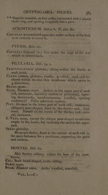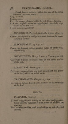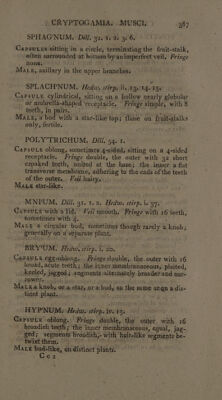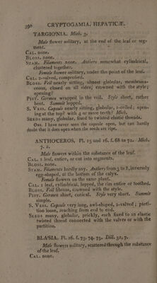 ![396. « CRYPTOGAMIA] HEPATICH. TARGIO'NIA. Mich. 3. | Male flower solitary, at the end of the leaf or seg- ‘ment. * Bs Pons tae i _CAL. none. ne | | Boss. none. : | , | wage ‘Stam. Filaments. none. , Anthers somewhat. cylindrical, clustered together. vase | + Female flower solitary, under the point of the leaf. . Cat. 2-valved, comprefsed. _ Bross. Veil nearly sitting, almost globular, membrana- ceous, closed on all sides; crowned with the style; opening? nee ah gs ee Pist. Germen wrapped in the veil. Style short, rather bent. Summit lopped. et ‘ S. Vess. Capsule nearly sitting, globular, 1-celled; open- ing at the top? with 4 or more tecth? Mich, | SEEDs many, globular, fixed to twisted elastic threads. Oss. I have never seen the capsule open, but can hardly doubt that it does open when the seeds are ripe. | _ <3 ANTHO'CEROS, Pl. 15 and 16, f.68:to 72. Mich, Jo Qe . | . ) Male flowers within the substance of the leaf. — Cat. 1 leaf, entire, or cut into segments. , a BLoss. none. ; | Stam. Filaments hardly any. Anthers from 3 to 8, inversely egg-shaped, at the bottom of the calyx. Female flowers on the same plant. eka Cat. 1 leaf, cylindrical, lopped, the rim entire or toothed. Bross. Veil fibrous, crowned with the style. Pist. Germen short; conical. Style very short. Summit simple. Per ieonrars Rae S. Vess. Capsule very long, awl-shaped, 2-valved ; parti- tion loose, reaching from end to end. ia Seeps many, globular, prickly, each fixed to an elastic twisted thread connected with the valves or with the partition, | : BLA'SIA. Pl. 16. £..73-74+75« Dill. 315 7» Male flowers solitary, scattered through the substance of the leaf. ais | ' Cau. none, x \](https://iiif.wellcomecollection.org/image/b33086114_0001_0444.jp2/full/800%2C/0/default.jpg)