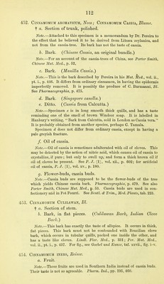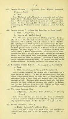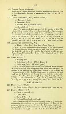 ![43 7. Chenopodium anthelminticum, continued. b. Essential oil. Note.—Wormseed is used as a vermifuge, chiefly for asearides n children. Of the oil, four to eight drops are given in sugar or in an emulsion, and followed by a purgative. This species and C. Botrys, to which latter the name of Jerusalem oak is more commonly applied, are said to possess also expectorant properties. For fig. of plant, see Bentley and Trimen, Med. Plants, tab. 216. PHYTOLACCACEiE. 438. Phytolacca decandra, L. (Garget or Poke, Pigeon Berry, ScoJce, Coakum.) a. Root. (Poke Boot.) b. Raceme of fruits. (Poke Berries.) Note.—The root and fruit are official in the secondary list of the U. S. Pharmacopoeia. The plant possesses emetic, cathartic, and narcotic properties ; it acts slowly, but the action continues for some time. The root when being powdered sometimes causes headache, and all the symptoms of coryza. Amer. Dispens., p. 634 ; Am. Journ. Pharm., May 1875, p. 196. PIPERACE^. 439. Artanthe elongata, Miq.; Piper angustifolium, B. et P. a. Leaves. (Matico.) 44Q. Artanthe adunca, Miq.; Piper aduncum, L. a. Leaves. (Spurious Matico.) Note.—The term matico is applied to several plants in different parts of South America. A. adunca is distinguished by the leaves not being strongly reticulated, and nearly glabrous beneath. See P. J. [2], vol. v., p. 290; Pharmacographia, p. 532; and note under Eupatorium gluti- nosum, No. 331. See also P. J. [1], vol. iii., p. 472; and for fig. of A. elongata, p. 525 ; and Bentley and Trimen, Med. Plants, tab. 242. 441. Chavica Roxbdrghii, Miq.; Piper officinarum, G. de G.; Piper LONGUM, L. a. Dried unripe fruit. (Long Pepper.) Note.—Long pepper comes principally from Java, where it is produced by Piper officinarum, C. de C. (Chavica officinarum, Miq.) In India, Ceylon, and the Philippine islands, Long Pepper is derived from C. Box- burghii. See Pharmacographia, p. 524. Bentl. & Trim., Med. PL, tab. 245. 442. Cubeba Clusii, 0. de C. (African Gubebs, Guinea Gubebs, West African Black Pepper, Benin Bepper.) a. Dried unripe fruit. b. Essential oil. Note.—This kind of Cubebs has occasionally been imported into London, the last time being in February, 1858. It is distinguished by its taste, which is very pungent, and resembles pepper more than cubebs. It also does not crack readily between the teeth, as cubebs does. It is smaller in size than cubebs, and the external surface is not wrinkled. The essential oil was prepared by Mr. Darby, of Leadenhall Street, for Messrs. Desnaux & Co. See P. J. [1], vol. xiv., pp. 198, 363, and for fig. of fruit, p. 201. See also Per. Mat. Med., vol. ii., pt. i., p. 392.](https://iiif.wellcomecollection.org/image/b21512668_0121.jp2/full/800%2C/0/default.jpg)