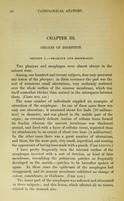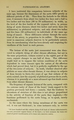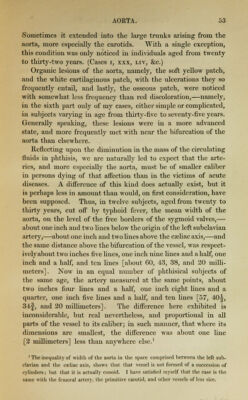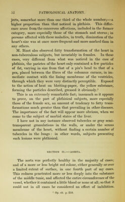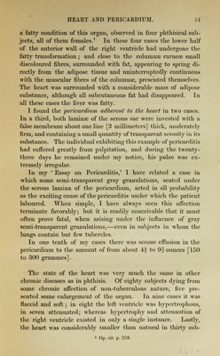 ![a fatty condition of this organ, observed in four phthisical sub- jects, all of them females.1 In these four cases the lower half of the anterior wall of the right ventricle had undergone the fatty transformation; and close to the columnar carneae small discoloured fibres, surrounded with fat, appearing to spring di- rectly from the adipose tissue and uninterruptedly continuous with the muscular fibres of the columnar, presented themselves. The heart was surrounded with a considerable mass of adipose substance, although all subcutaneous fat had disappeared. In all these cases the liver was fatty. I found the pericardium adherent to the heart in two cases. In a third, both laminae of the serous sac were invested with a false membrane about one line [2 millimeters] thick, moderately firm, and containing a small quantity of transparent scrosity in its substance. The individual exhibiting this example of pericarditis had suffered greatly from palpitation, and during the twenty- three days he remained under my notice, Ins pulse Mas ex- tremely irregular. In my ' Essay on Pericarditis,' I have related a case in which some semi-transparent gray granulations, seated under the serous lamina of the pericardium, acted in all probability as the exciting cause of the pericarditis under which the patient laboured. When simple, I have always seen this affection terminate favorably; but it is readily conceivable that it must often prove fatal, when arising under the influence of gray semi-transparent granulations,—even in subjects in whom the lungs contain but few tubercles. In one tenth of my cases there was serous effusion in the pericardium to the amount of from about 4y to 9J ounces [150 to 300 grammes]. The state of the heart was very much the same in other chronic diseases as in phthisis. Of eighty subjects dying from some chronic affection of non-tuberculous nature, five pre- sented some enlargement of the organ. In nine cases it was flaccid and soft; in eight the left ventricle was hypertrophous, in seven attenuated; whereas hypertrophy and attenuation of the right ventricle existed in only a single instance. Lastly, the heart was considerably smaller than natural in thirty sub-](https://iiif.wellcomecollection.org/image/b21015235_0091.jp2/full/800%2C/0/default.jpg)
