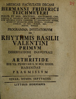 Programma invitatorium de rhythmis Basilii Valentini primum dissertationi inaugurali de arthritide ... labendae praemissum / [Hermann Friedrich Teichmeyer].