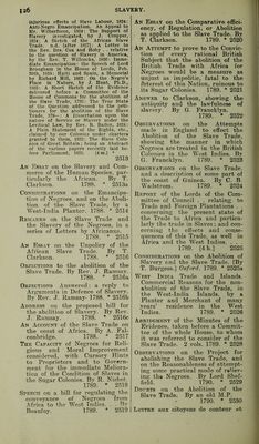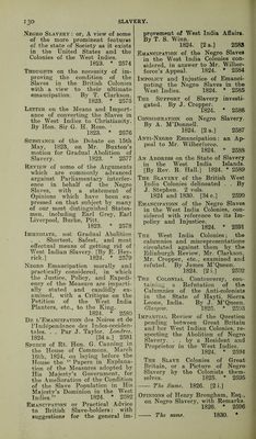 ![Negro Slavery : or, A view of some of the more prominent features of the state of Society as it exists in the United States and the Colonies of the West Indies. 1823. * 2574 Thoughts on the necessity of im- proving the condition of the Slaves in the British Colonies with a view to their ultimate emancipation. By T. Clarkson. 1823. * 2575 Letter on the Means and Import- ance of converting the Slaves in the West Indies to Christianity. By Hon. Sir G. H. Rose. 1823. * 2576 Substance of the Debate on 15th May, 1823, on Mr. Buxton’s motion for Gradual Abolition of Slavery. 1823. * 2577 Review of some of the Arguments which are commonly advanced argainst Parliamentary interfer- ence in behalf of the Negro Slaves, with a statement of Opinions which have been ex- pressed on that subject by many of our most distinguished States- men, including Earl Grej^ Earl Liverpool, Burke, Pitt. 1823. * 2578 Immediate, not Gradual Abolition . . Shortest, Safest, and most effectual means of getting rid of | West Indian Slavery. [By E. Hey- rick.] 1824. * 2579 Negro Emancipation morally and practically considered, in w^hich the Justice, Policy, and Expedi- ency of the Measure are imparti- ally stated and candidly ex- amined, with a Critique on the Petition of the West India Planters, etc., to the King. 1824. * 2580 De l’Emancipation des Noires et de r Independence des Indes-occiden- tales. . . Par J. Taylor. Londres. 1824. [34 a.]_ 2581 Speech of Rt. Hon. G. Canning in the House of Commons, March 16th, 1824, on laying before the House the “ Papers in Explana- tion of the Measures adopted by His Majesty’s Government,_ for the Amelioration of the Condition of the Slave Population in His Majesty’s Dominion in the West Indies.'” 1824. * 2582 Emancipation or Practical Advice to British Slave-holders: with suggestions for the general im- provement of W”est India Affairs. By T. S. Winn. 1824. [2 a.] 258A Emancipation of the Negro Slaves in the West India Colonies con- sidered, in answer to Mr. Wilber- force’s Appeal. 1824. * 2584 Impolicy and Injustice of Emanci- pating the Negro Slaves in the West Indies. 1824. * 2585 The Support of Slavery investi- gated. By J. Cropper. 1824. * 2586 Consideration on Negro Slavery. By A. M’Donnell. 1824. [2 a.] 2587 Anti-Negro Emancipation: an Ap- peal to Mr. Wilberforce. 1824. * 2583 An Address on the State of Slavery in the West India Islands. [By Rev. R. Plall.] 1824. * 2589 The Slavery of the British West India Colonies delineated . . By J. Stephen. 2 vols. 1824 and 1830. [34 c.] 2590 Emancipation of the Negro Slaves in the West India Colonies, con- sidered with reference to its Im- policy and Injustice. 1824. * 2591 The West India Colonies; the calumnies and misrepresentations circulated against them by the Edinburgh Review, Mr. Clarkson, Mr. Cropper, etc., examined and refuted. By James M’Queen. 1824. [2 i.] 2592 The Colonial Controversy, con- taining a Refutation of the Calumnies of the Anti-colonists in the State of Hayti, Sierra Leone, India. By J. M’Queen. Glasgow. 1825. * 2593 Impartial Review of the Question pending between Great Britain and her West Indian Colonies, re- specting the Abolition of Negro Slavery. . . by a Resident and Proprietor in the West Indies. 1824. * 2594 The Slave Colonies of Great Britain, or a Picture of Negro Slavery by the Colonists them- selves. 1825. * 2595 The Same. 1826. [2 i.j Opinions of Henry Brougham, Esq., on Negro Slavery, with Remarks. 1826. * 2596 The same. 1830. *](https://iiif.wellcomecollection.org/image/b24862964_0144.jp2/full/800%2C/0/default.jpg)
