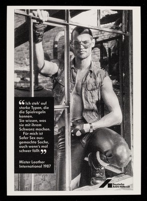 Credit: "Ich steh' auf starke Typen, die die Spielregeln kennen : Sie wissen, was sie mit ihrem Schwanz machen. Für mich ist Safer Sex ausgemachte Sache, auch wenn's mal schwer fällt." / Mister Leather International ; Deutsche AIDS-Hilfe ; Foto Helmut Röttgen ; Gestaltung Detlev Pusch. Source: Wellcome Collection.