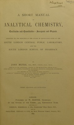 A short manual of analytical chemistry : qualitative and quantitative inorganic and organic arranged on the principle of the course of instruction given at the South London Central Public Laboratory and the South London School of Pharmacy / by John Muter.