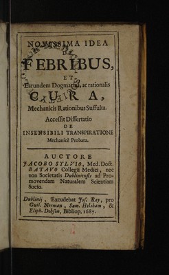 Novissima idea de febribus, et earundem dogmatica, ac rationalis cura, mechanicis rationibus suffulta. Accessit dissertatio de insensibili transpiratione mechanice probata / [Jacobus Sylvius].