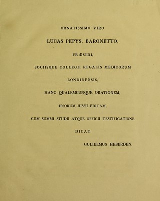 Credit: Oratio Harveiana in honorem medicinae, inque memoriam eorum, qui de Collegio Regali Medicorum Londinensi bene Meriti sunt, ex instituto celeberrimi viri Gulielmi [sic] Harveii ... 1809 / [William Heberden]. Source: Wellcome Collection.