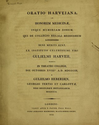 Oratio Harveiana in honorem medicinae, inque memoriam eorum, qui de Collegio Regali Medicorum Londinensi bene Meriti sunt, ex instituto celeberrimi viri Gulielmi [sic] Harveii ... 1809 / [William Heberden].