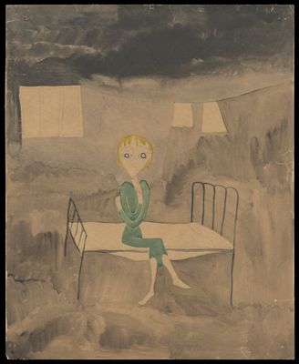 Credit: A woman wearing a green dress seated on a bed with a window behind her on a black ground. Source: Wellcome Collection.