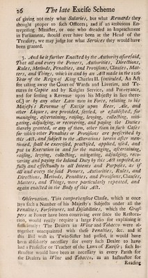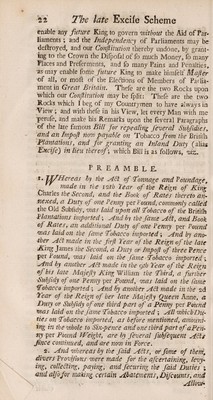 The late excise scheme dissected: or, an exact copy of the late bill for repealing several subsidies, and an impost, now payable on tobacco, etc. With all the blanks filled up, as the probably would have been, if the bill had passed into a law; and proper observations on each paragraph. [Anon.] / [William Pulteney].