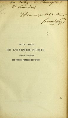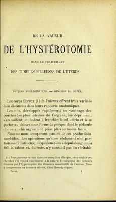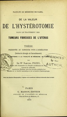 De la valeur de l'hystérotomie dans le traitement des tumeurs fibreuses de l'utérus : thèse présentée au concours pour l'agrégation (section de chirurgie et d'accouchements) et soutenue à la Faculté de médecine de Paris / par Samuel Pozzi.