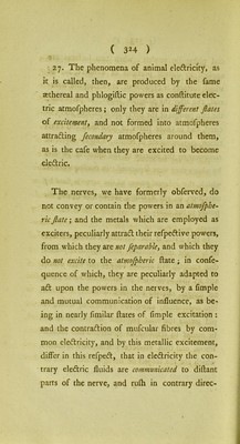 Credit: Physiology, or, An attempt to explain the functions and laws of the nervous system : the contraction of muscular fibres, and the constant and involuntary actions of the heart, the stomach, and organs of respiration, by means of simple, universal, and unvarying principles : to which are added, observations on the intellectual operations of the brain : and on the diversity of sensations : with remarks on the effects of poisons : and an explanation of the experiments of Galvani and others, on animal electricity / by E. Peart. Source: Wellcome Collection.