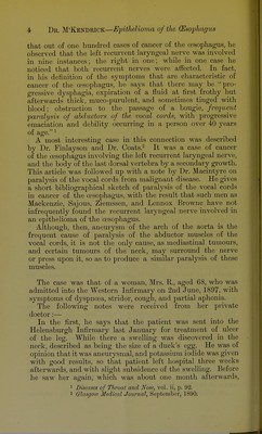 Case of epithelioma of the oesophagus involving the pneumogastric nerve with its recurrent branch on the right side, and where the symptoms closely pointed to aneurysm of the arch of the aorta / by J. Souttar M'Kendrick.