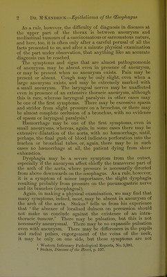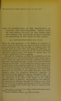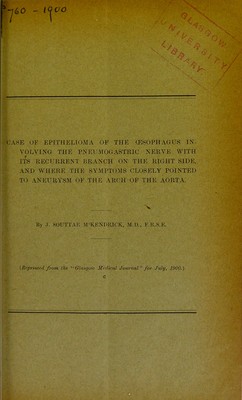 Case of epithelioma of the oesophagus involving the pneumogastric nerve with its recurrent branch on the right side, and where the symptoms closely pointed to aneurysm of the arch of the aorta / by J. Souttar M'Kendrick.