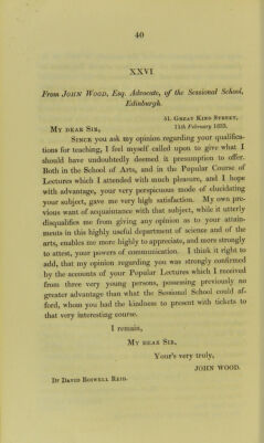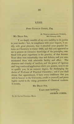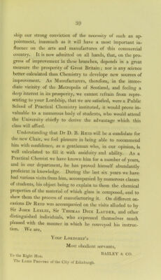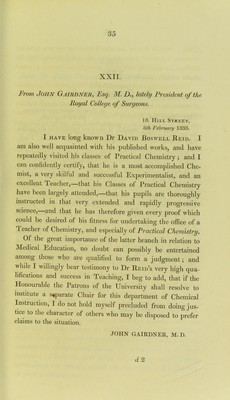 Testimonials regarding Dr D. B. Reid's qualifications as a lecturer on chemistry, and as a teacher of practical chemistry.