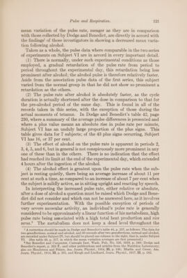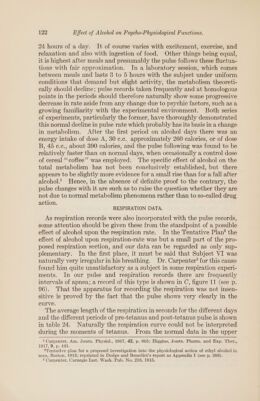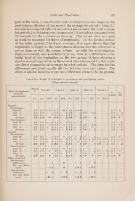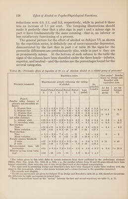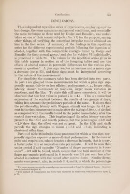 ![reductions were 4.0, 3.1, and 3.5, respectively, while in period 6 there was an increase of 7.1 per cent. The foregoing illustrations should make it perfectly clear that a plus sign in part 1 and a minus sign in part 1 have fundamentally the same meaning—that is, an inferior or less satisfactory functioning of a process. The general picture for the effect of alcohol on Subject VI, as shown by the repetition series, is definitely one of neuro-muscular depression, demonstrated by the fact that in part 1 of table 26 the signsfor the percentile differences are predominantly plus, while in part 1 they are as prominently minus. At the bottom of each column in the table the signs of the column have been classified under the three heads—infer ior, superior, and neutral—and the entries are the percentages found for the several categories. Repetition series. First series.2, Results found by Dodge and Benedict with equivalent dose. Experimental periods following the taking Processes measured. of alcohol. Avy. - oe ee pee eae Av. for Av. for Period| Period| Period| Period| Period Last » ands.) normal Subject 2. 3. 4, 5. 6. period. group. VI. Part I. Patellar reflex (latency of primary and secondary re- flexes): L, 30-gram blow........ + 4.1/+ 0.9}+ 2.9)- 7.3;-— 1.5) — 9.8] + 2.6 La 11.1 iv 0.3 L, 50-gram blow........ + 2.1/+ 0.9 0 |— 8.9}-— 4.5) — 12.0) + 1.0 : ; L’, 30-gram blow....... 0 j+ 2.6/4+11 |-— 9.2}-— 5.3) — 5.38} + 4.5 19 4.0 (3) L’, 50-gram blow....... + 1.3)/+ 2.7;+ 1.1)/+21.0)/— 16.0) — 15.0) + 1.7 Lid reflex (latency): L, primary wink....... +13.3)+ 5.7;/-— 2.9/+ 6.4/+ 4.3] — 5.8) + 5.4] + 5.9 — 4.6 L’, secondary wink..... +15.0)+ 0.7)/-— 7.5/-— 3.7)/+ 3.7| — 6.7) + 2.7; + 6.8 — 10.7 Eye reaction: dhirs os eA Lene oS eee +12.0/+13 |+ 9.5)4+ 6.2;— 1.9] + 8.1] +11.5] — 5.4 — 9.3 Mean variation........ +34 |+41 |+ 6.3)/-—25 |+ 47 + 22 +2131 1 1 kb. beeen eee Word reaction: LET G aieerot ee Sirs kk ews. 8 + 3.1/— 9.0;— 7.4;-11 |—- 21 — 9.6) — 4.4 0 -— 6§ Mean variation........ — 2.0)+ 7.0 O |+21 |+ 25 +b 35. Oiri-F 1k al i. ee oe eee oe eee Faradic sensory threshold: 7; VOPR eieos FER. ss +17 |+ 0.9/+ 5.3)/+ 6.2}— 11 + 0.9} + 7.7} + 21 + 48 BoaGS ok sh a Mere +32 {+10 |+ 7.3/+25 |— 7.9] + 24 1-10.41 0. Fo. ue oul eee ee Eye-movement time, left MOVveiwornts spas. 643 oo LS9 +14 |4+ 6.4/+ 7.2)4+ 5.0/— 2.1) + 3.0) + 9.2] + 3.4 |4+ 25.8 Memory saving, mean varia- COL Crees oes ee ee +10 j};=—10 |+13 [—15 |— 5.0] — 10.0) + 4.3] ........] ........ 1 The values given in this table differ in certain instances from those published in the preliminary abstract (Miles, Proc. Nat. Acad. Sci., 1916, 2, p. 703), e. g., the patellar reflexes from 30 and 50 gram stimuli have been treated separately; there were also one or two errors discovered in the original computations. 2 The signs used in presenting Dodge and Benedict’s data have been changed to make them conform with the usage in this monograph, where a plus means increase and a minus decrease in the quantities measured. 3 The records were illegible. 4 No left eye movements are given for Subject VI in Dodge and Benedict’s table 28, p. 166; therefore the percen- tile difference for right movements is entered here. 5 From computations based on the “‘saving’’ between the first and second reactions; see table 11, p. 71.](https://iiif.wellcomecollection.org/image/b32847117_0138.jp2/full/800%2C/0/default.jpg)