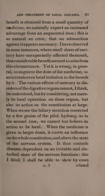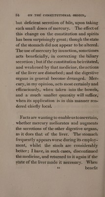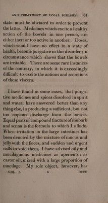 ![state must be obviated in order to prevent the latter. Medicines which excite a healthy action of the bowels in one person, are either inert or too active in another. Doses, which would have no effect in a state of health, become purgative in this disorder; a eircumstance which shows that the bowels are irritable. There are some rare instances of the contrary, in which it is exceedingly difficult to excite the actions and secretions of these viscera. I have found in some cases, that purga- tive medicines and spices dissolved in spirit and water, have answered better than any thing else, in producing a sufficient, but not too copious discharge from the bowels. Equal] parts of compound tincture of rhubarb and senna is the formula to which I allude. - When irritation in the large intestines has been denoted by the mixture of mucus and jelly avith the feeces, and sudden and urgent calls to void them, I have advised oily and mucilaginous medicines as aperients: as castor oil, mixed with a large proportion of mucilage. My sole object, however, has WOL. I. G been](https://iiif.wellcomecollection.org/image/b33278611_0103.jp2/full/800%2C/0/default.jpg)