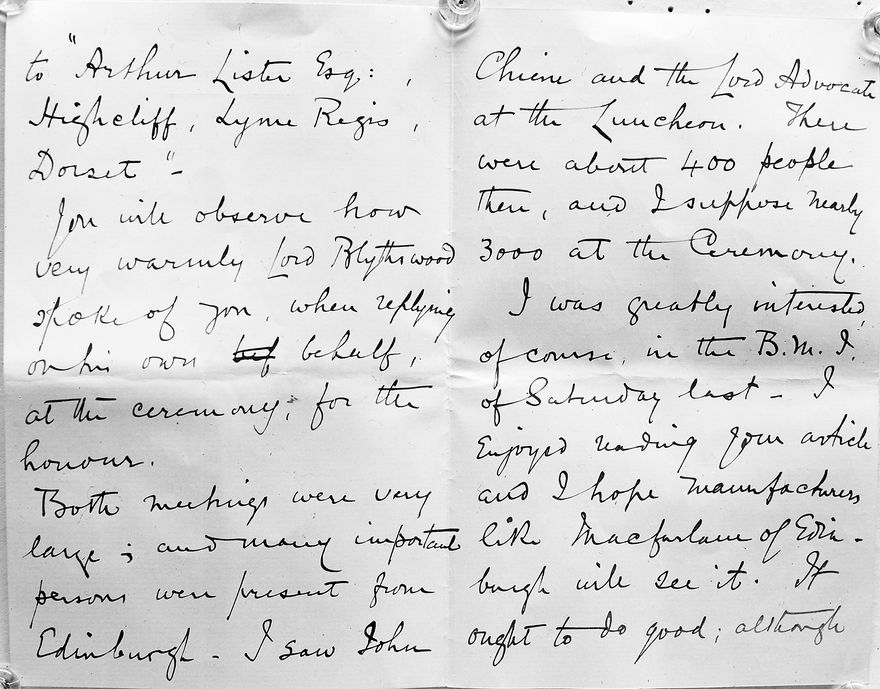 Credit: M0019598ED: Letter to Joseph Lister from Sir Hector C. Cameron, 1908: middle pages. Source: Wellcome Collection.