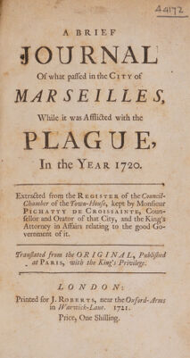 A brief journal of what passed in the city of Marseilles, while it was afflicted with the plague, in the year 1720 / Extracted from the register of the Council-Chamber of the Town-House, kept by Monsieur Pichatty de Croissainte ... Translated from the original, published at Paris.