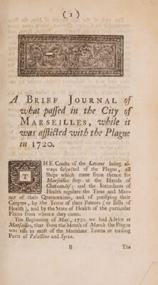 Credit: A brief journal of what passed in the city of Marseilles, while it was afflicted with the plague, in the year 1720 / Extracted from the register of the Council-Chamber of the Town-House, kept by Monsieur Pichatty de Croissainte ... Translated from the original, published at Paris. Source: Wellcome Collection.