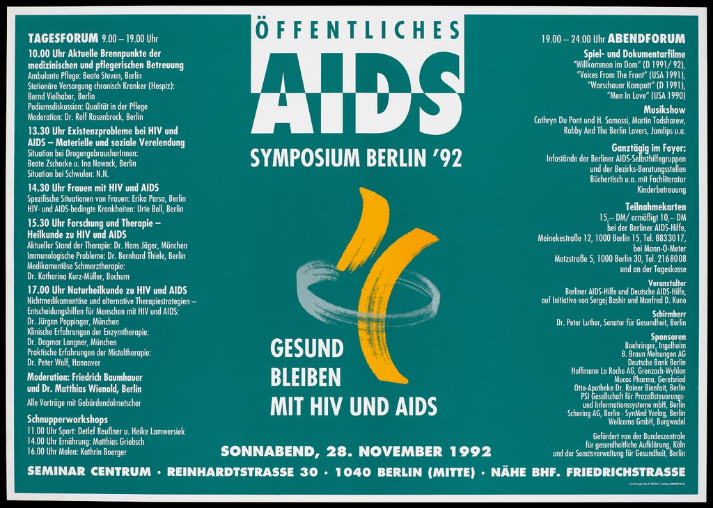 Credit: Two yellow lines encircled by a grey/green line at the centre of a poster with details of the Public AIDS Symposium in Berlin on 28 November 1992 at the Seminar Centrum, Berlin; organised by Berliner AIDS-Hilfe, Deutsche AIDS-Hilfe, an initiative of Sergei Bashir and Manfred D. Kuno. Colour lithograph by ComDesign. Source: Wellcome Collection.