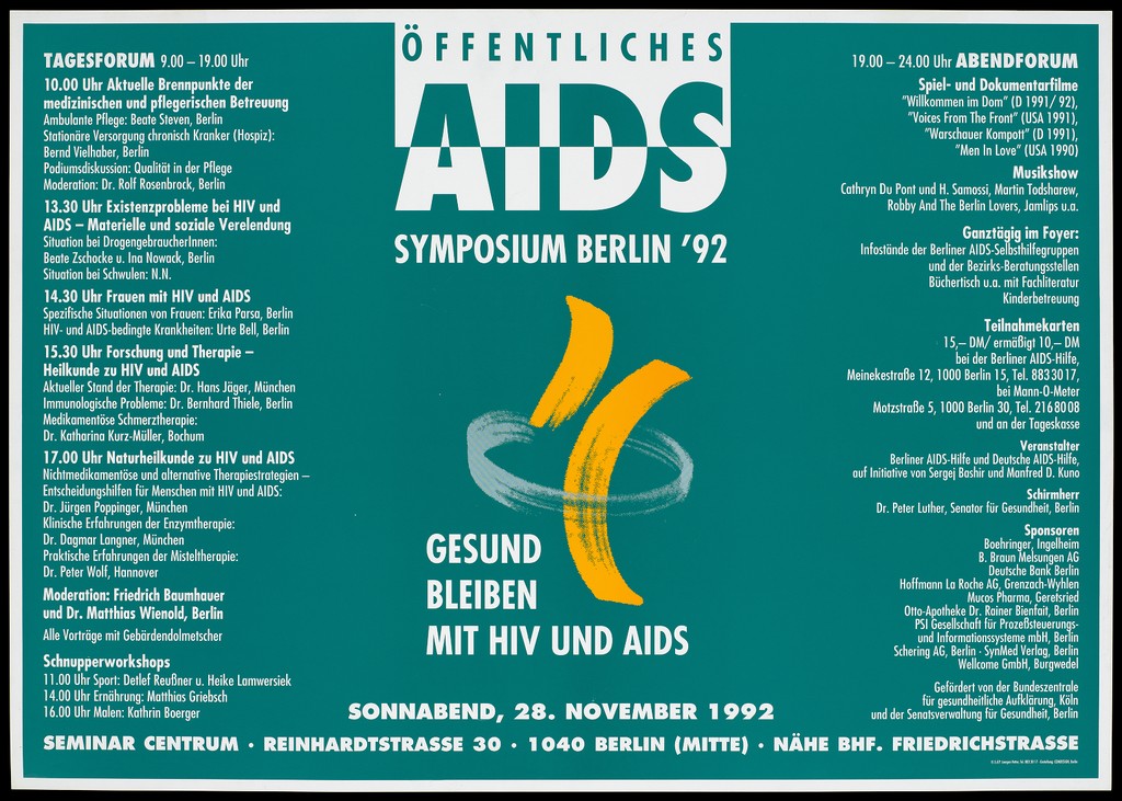 Two yellow lines encircled by a grey/green line at the centre of a poster with details of the Public AIDS Symposium in Berlin on 28 November 1992 at the Seminar Centrum, Berlin; organised by Berliner AIDS-Hilfe, Deutsche AIDS-Hilfe, an initiative of Sergei Bashir and Manfred D. Kuno. Colour lithograph by ComDesign.