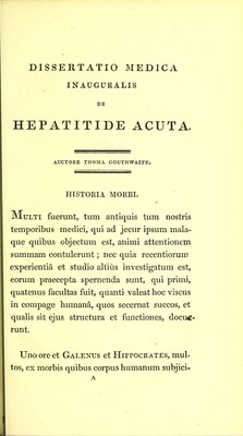 Credit: Dissertatio medica inauguralis de hepatitide acuta ... / eruditorum examini subjicit Thomas Gouthwaite. Source: Wellcome Collection.