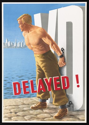 Credit: A soldier chained to the letters "VD" and therefore unable to visit New York City, visible across the water. Colour lithograph by F.O. Schiffers, 1946. Source: Wellcome Collection.