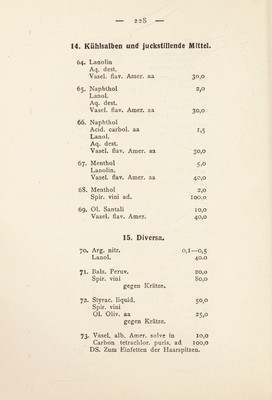 ![5,0 o,4 107. Hydrarg. tannic. oxydul. Op. puri Mass. pill. q. s. ad. pill. No. ioo. DS. 3Xlägl. 2—3 Pillen. 108. i Mercalator-Maske nach Beiersdorf. DS. Zur Inhalation nach einer Woche. (Nähere Gebrauchsanweisung liegt jeder Maske bei.]) 22. Suppositorien. 109. Morph, mur. 0,05 Ol. Cacao 4,0 fiant. supp. No. II. 110. Extract. Bellad, 0,1 01. Cacao 4,0 fiant. supp. No. III. in. Albargin 0,4 01. Cacao 20,0 fiant. supp. No. X. II2. Protargol 2,0 OL Cacao 20,0](https://iiif.wellcomecollection.org/image/b29818588_0252.jp2/full/800%2C/0/default.jpg)