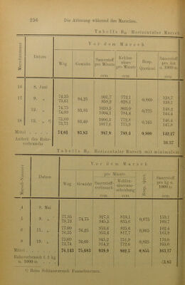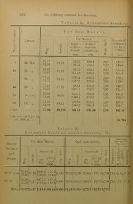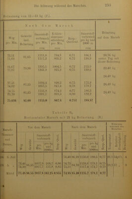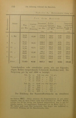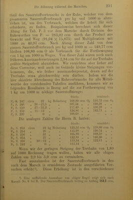 ![I' a b e 1 I c Dg. Horizontaler Marsch - £—1 o a V o r de m M a r s c h s p Ö r~] o CO 5 S Datum Weg Gewicht Sauerstoff pro Minute Kohlen- säure pro Minute Resp. Quotient Sauerstof pro km u.1000 n ccm ccm ccm 16 8. Juni 17 9. „ 74,35 73,61 94,25 901,7 958,2 772.1 828.1 0,860 128.7 138,1 12. „ 74,75 74,09 93,85 1039,5 1004,1 803.0 784,4 0,775 148.2 144.4 18 13. „ !) 73,60 73,71 93,40 1006,3 1017,6 772.8 775.9 0,765 146.4 147,8 Mittel .... 74,01 93,83 987,9 789,4 0,800 142.27 Antheil des Ruhe- verbrauchs 1 36.37 Tabelle B7. Horizontaler Marsch mit minimalem O A o r de m M a r s c h £ Datum pro Minute Sauerstoff pro kg u. 1000 m ccm 1 C/j 3 Weg Gewicht Sauerstoff- verbrauch ccm Kohlen- säureaus- scheidung ccm Q? Ph ZA O 4 i 8. Mai 5 9. „ 77,95 78,73 74,75 927,3 945,5 810.1 835,6 0,875 159.1 160.7 6 11. „ 77.00 76,35 76,25 953,6 953,4 825.6 817.7 0,865 162,4 163.8 8 19. „ 73,09 73,74 76,05 945.2 914.2 751.9 772,6 0,825 170.0 163.0 Mittel . 70,143 75,683 939,9 802,3 0,855 163.17 Ruheverbrauch f. 1 kg u. 1000 m ... 43.83 J) Beim Schiussversuch Fussschmerzen.](https://iiif.wellcomecollection.org/image/b28068592_0282.jp2/full/800%2C/0/default.jpg)