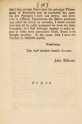 Several essays towards discovering the laws of electricity. Communicated to the Royal Society / by John Ellicott, F.R.S. ; To which is prefixed, part of a letter from the Abbè Nollet, member of the Royal Academy of Sciences at Paris, and F.R.S. to Martin Folkes [Translated by T. Stack.] president of the same.