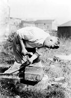 M0015968: Leon Coutier demonstrating the production of blades by the use of the hammer and punch method. In copyright. Source: Wellcome Collection.