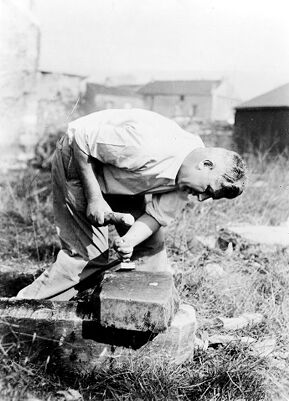 M0015968: Leon Coutier demonstrating the production of blades by the use of the hammer and punch method